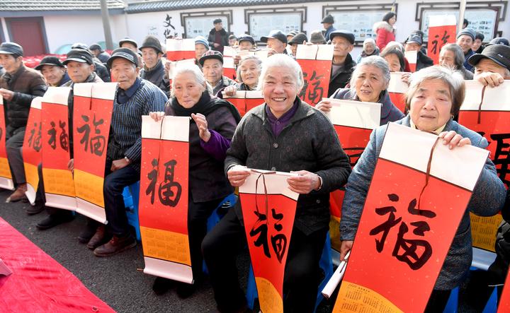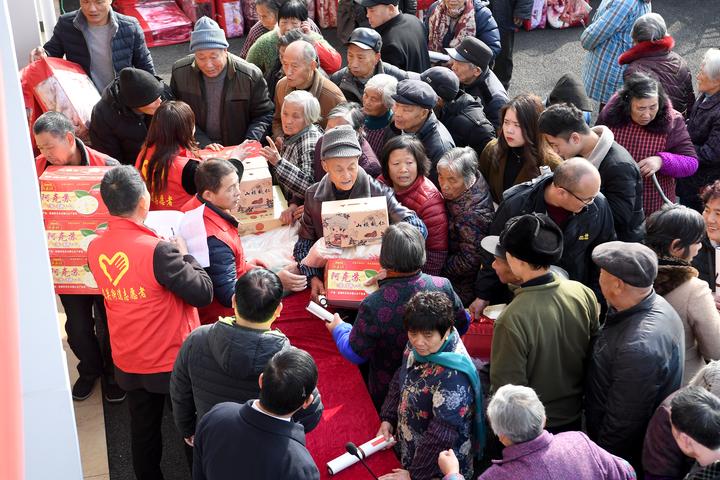 春節前夕,東關街道東風村村委會里擠滿了排隊的老人,這里正在舉行一場迎新春敬老送福活動。全村236位75歲老人都領到了一個“福”字掛幅和毛毯、女兒紅酒、蘋果等禮物。